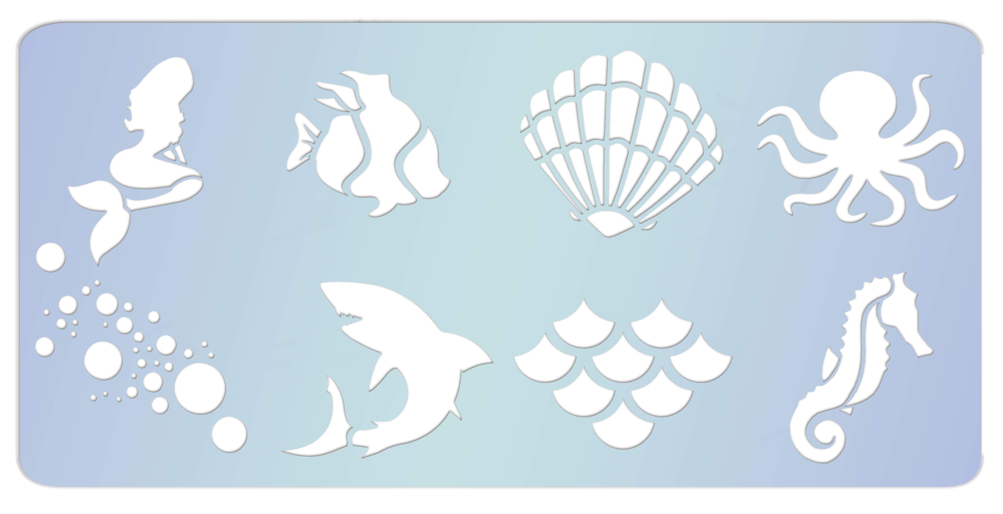 Mermaid, Shark, Shells, Seahorse, Bubbles, Fish, Scales, Octopus.